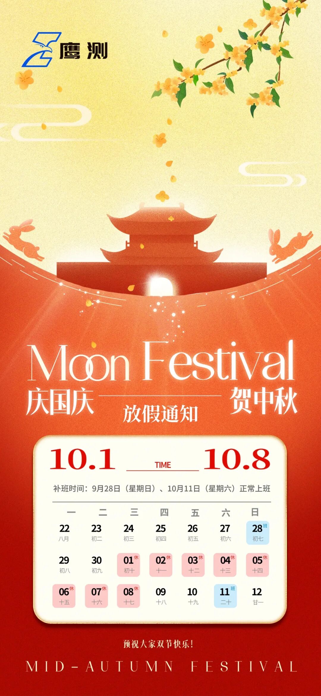 中华人民共和国成立76周年及中秋节即将到来,我司定于2025年10月1日-10月8日放假,9月28日(周日)、10月11日(周六)正常上班。