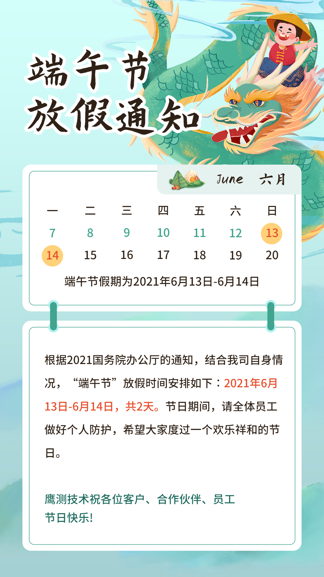 2021端午节放假通知 2021-06-10 作者: 广东鹰测技术有限公司 端午假期过后,我司即将迁新址,请需要备货的客户提前沟通,我们将尽快为您安排发货!因此带来的不便敬请谅解!祝大家端午安康!节日愉快! 返回列表