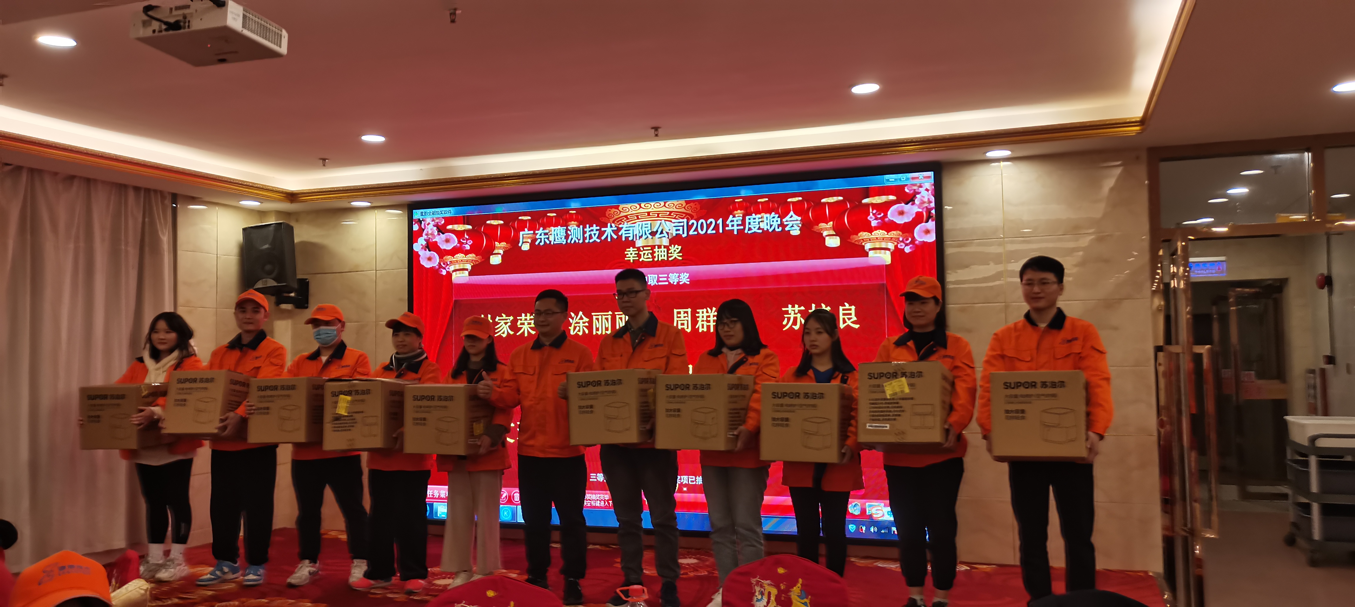 ▲大家最期待的当然是晚会的抽奖环节,最先抽取的三等奖,一共10位,奖品是苏泊尔空气炸锅一台。上图为获得三等奖的同事上台领奖。