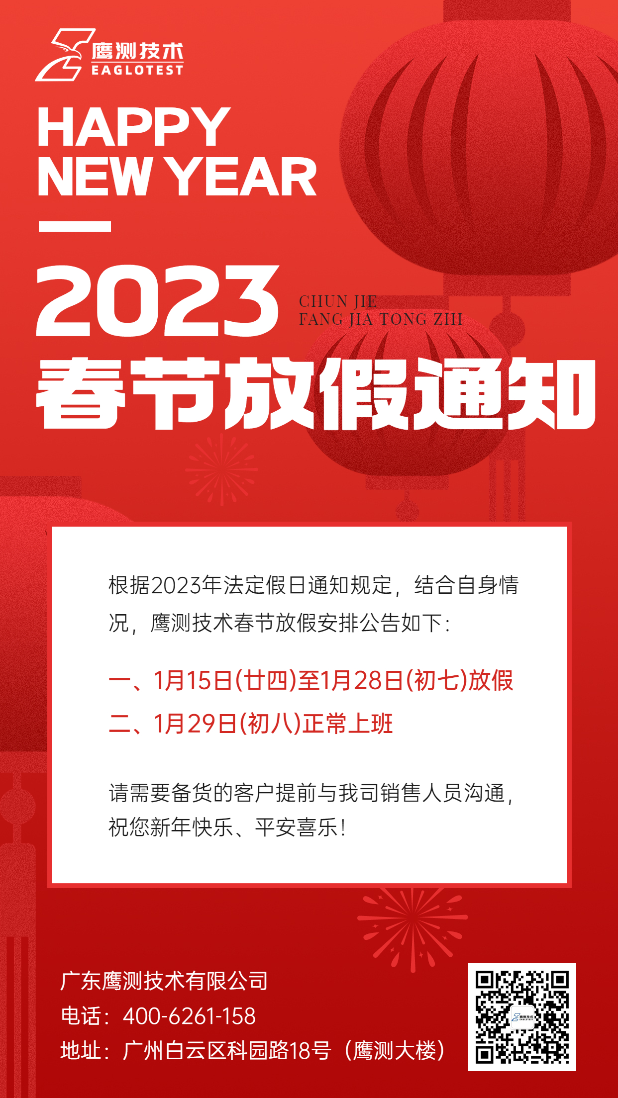 鹰测技术2023春节放假通知